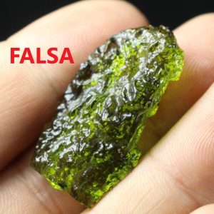 Há bastantes Moldavitas falsas online, a diferença é aparente, a Moldavita falsa é geralmente da cor dos frascos verdes derretidos, comparáveis à cor de uma garrafa de cerveja verde, com uma aparência homogénea similar à da gelatina.